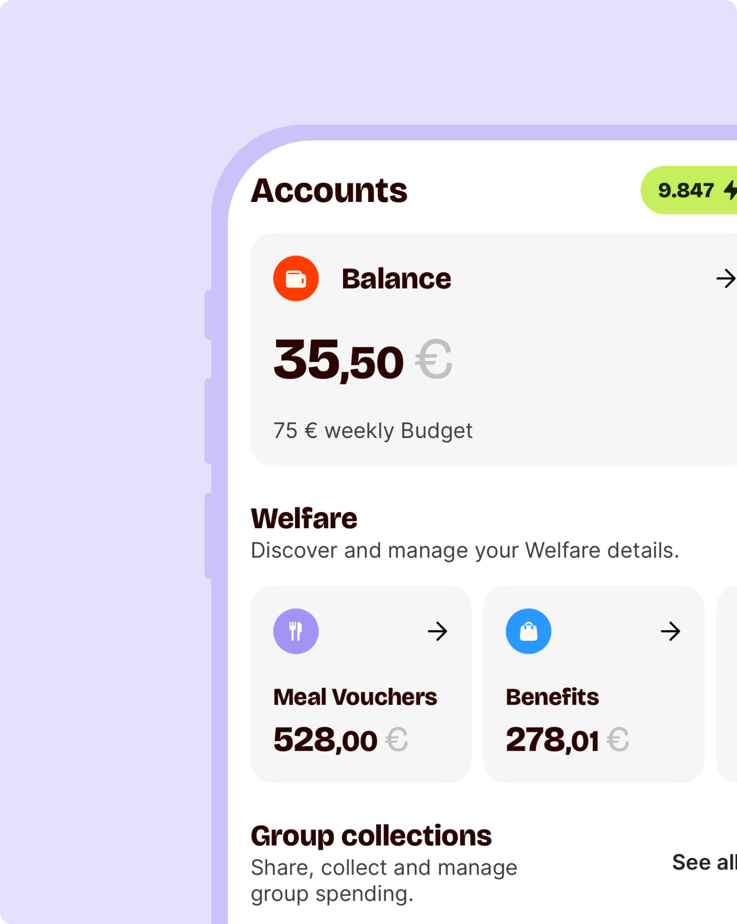 In every section of the app you are in, you can see how much money you have available. Next to the name of the Stores, Services, or Contacts pages, you will find the € symbol. Tap it to see your total balance.