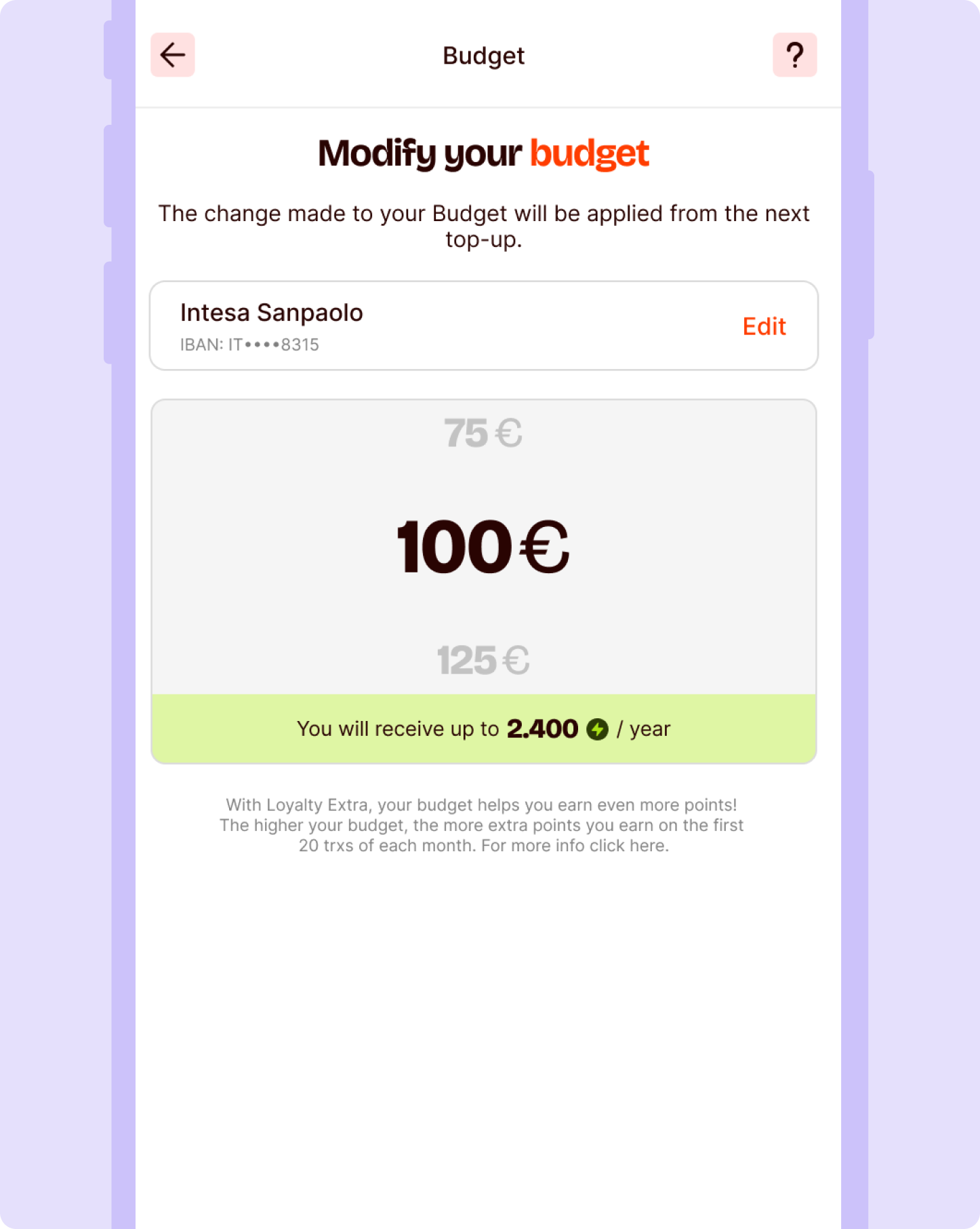 You have total freedom and flexibility to manage your Budget. Go to Profile > Manage Balance > Budget > Advanced Settings and choose the minimum top-up threshold and the weekly or monthly crediting frequency.