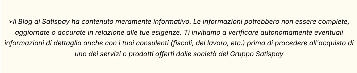 I servizi di pagamento sono forniti da Satispay Europe S.A., iscritta al n. W00000010 dell'Albo degli Istituti di Moneta Elettronica presso la Commission de Surveillance du Secteur Financier e al n. B229149 del Registro delle Imprese del Lussemburgo. Sede legale: 53, Boulevard Royal, L-2449 Lussemburgo.