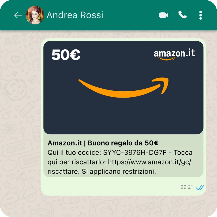 Dopo l’acquisto, invia il codice PIN del Buono Regalo Amazon.it al tuo contatto tramite l’app di messaggistica che preferisci.
