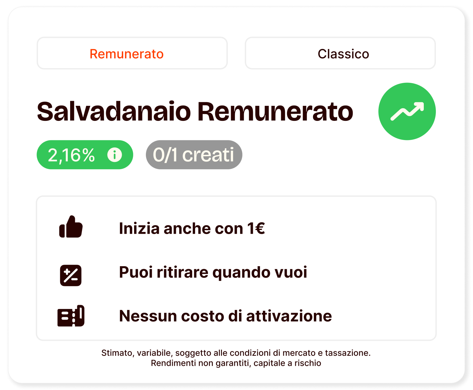 Questa è una comunicazione promozionale. Con il Salvadanaio Remunerato puoi investire in un fondo monetario che presenta un rischio molto basso. Tuttavia, il capitale non è garantito ed è soggetto al rischio di perdita. Il rendimento è variabile ed è influenzato dalle condizioni di mercato, compresi i rischi di tasso e di credito. Il rendimento annualizzato è una stima che si riferisce al rendimento medio ponderato dei titoli in cui investe il fondo monetario al netto dei costi del fondo. Gli scenari presentati sono una stima del rendimento futuro sulla base di prove relative alle variazioni passate del valore di questo investimento e/o sulla base delle condizioni attuali del mercato e non sono un indicatore esatto. Gli importi dei rimborsi varieranno a seconda della performance del mercato e del periodo di tempo per cui è mantenuto l’investimento. I rendimenti sono soggetti a tassazione, la quale dipende dalla situazione personale di ciascun investitore e può cambiare in futuro. Consulta la documentazione del fondo prima di investire.
