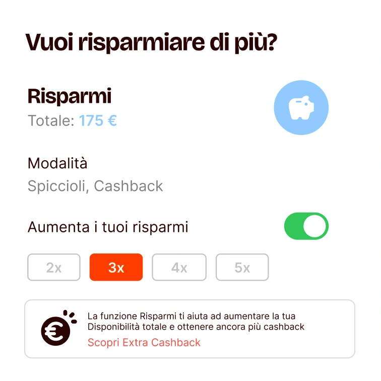 👛 Spiccioli: accantoni il resto di ogni acquisto arrotondato all’euro (se paghi 1,70€, vengono trasferiti nel Salvadanaio 0,30€).